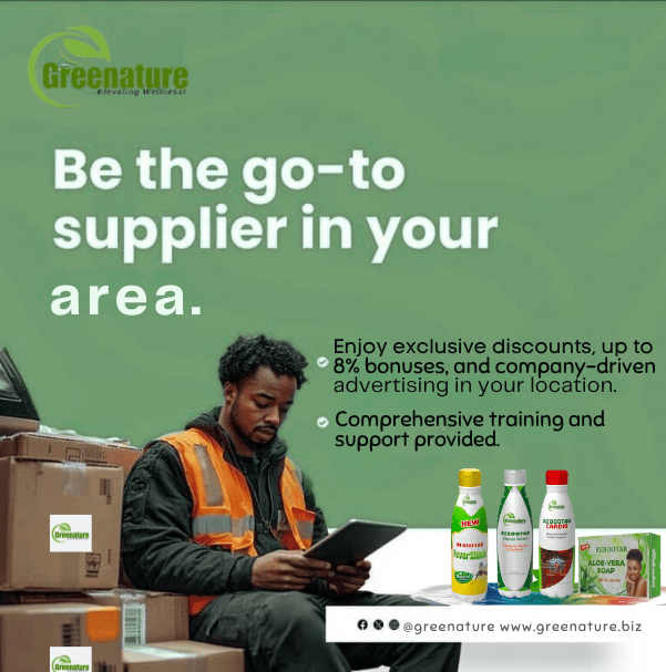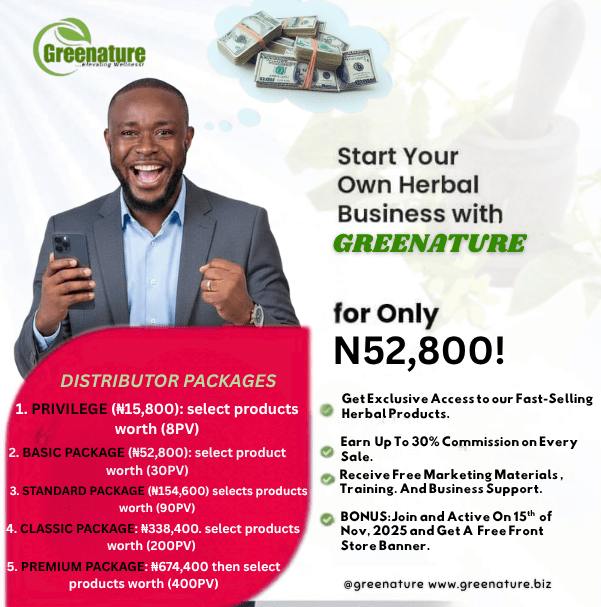 An opportunity to make money for yourself and be financially freed. It comes with other bonuses.Your registration qualifies you to become a bonafide member and partner of GREENATURE INTERNATIONAL. You will be given a unique ID and access to our portal so you can access your performance on the go. Call/Whatsapp : +2347064848268 for details of joining our team of PIONEER DISTRIBUTORS.